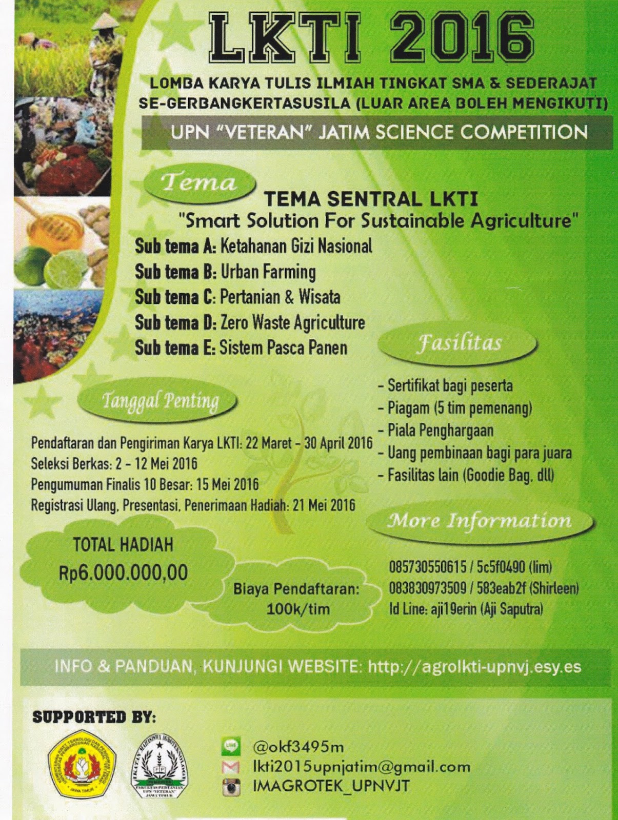 April 13, 2016February 17, 2020 KepadaYth. Kepala SMA Negeri/Swasta & Sederajat Download LOMBA KARYA TULIS ILMIAH, click DISINI Info:Dinas Pendidikan Kota SurabayaBidang Dikmen & KejuruanCP:08175116494