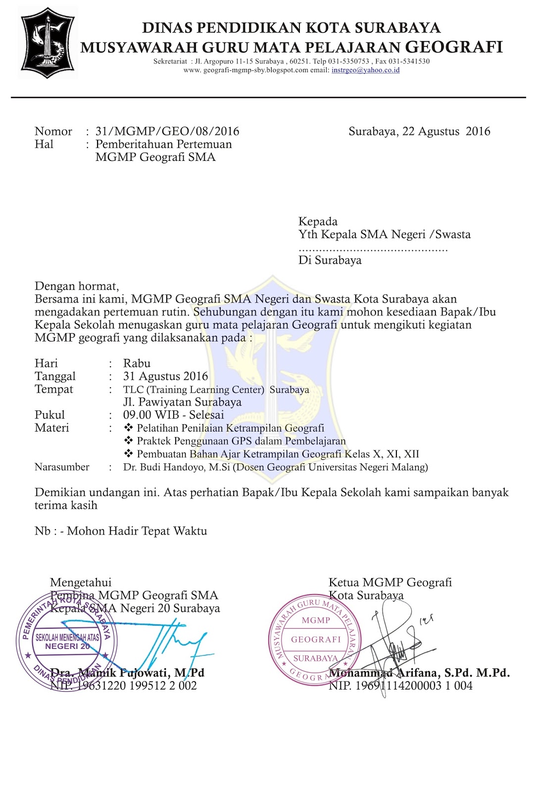 August 31, 2016February 19, 2020 KepadaYth. Kepala SMA Negeri / Swasta Kota SurabayaSifat : SegeraHal: Pemberitahuan Pertemuan MGMP Geografi SMA Silahkan Saudara unduh/download surat diatas, Click DISINI